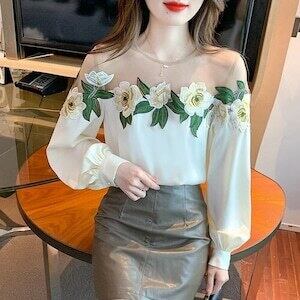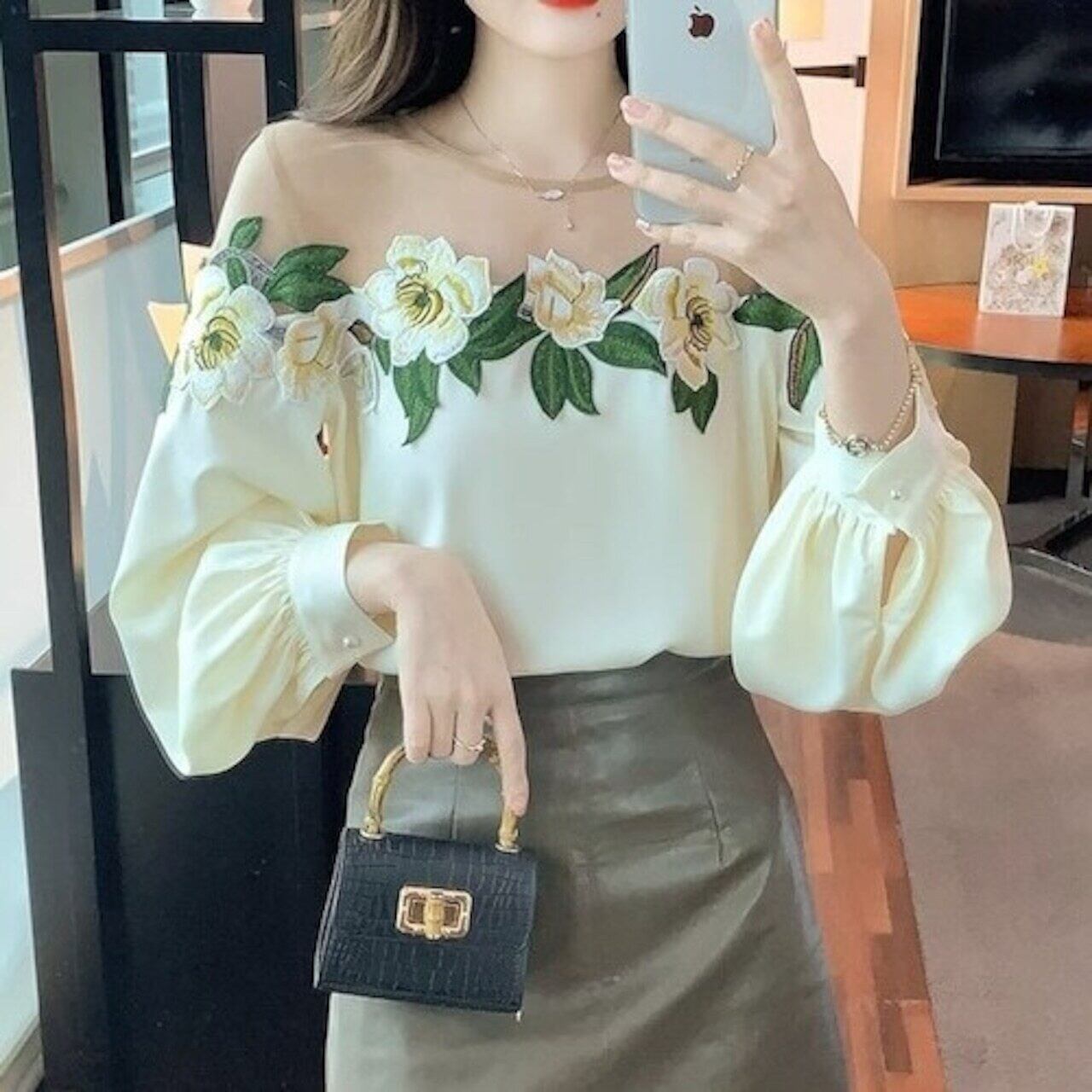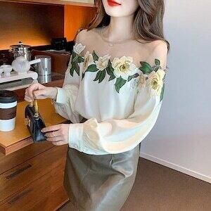 花柄トップス シアーネック ブラウス エレガント ガーリー E557