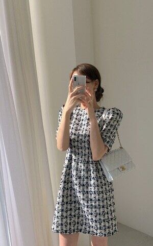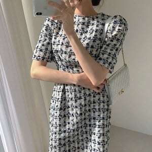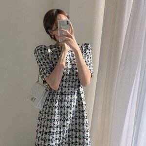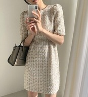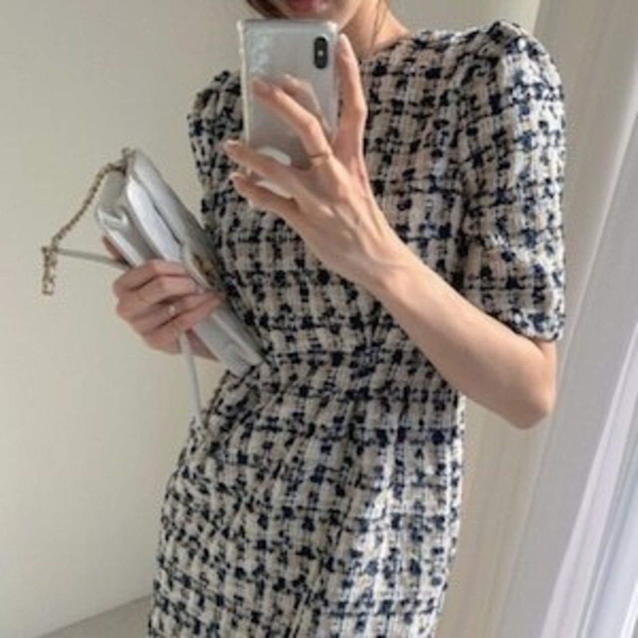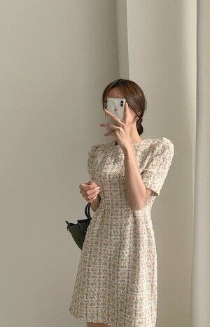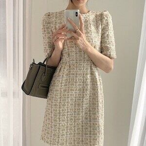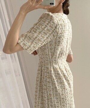 ツイードワンピース 半袖ワンピ ミニ丈 オフィスカジュアル お呼ばれ E800