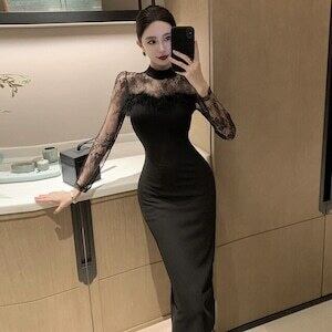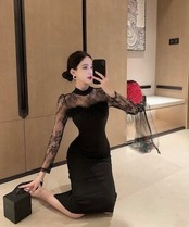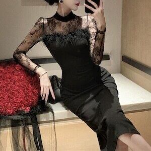 お呼ばれワンピース レースワンピ ファー付き タイトシルエット エレガント E737
