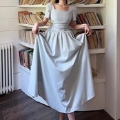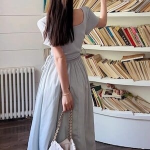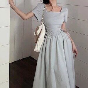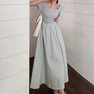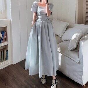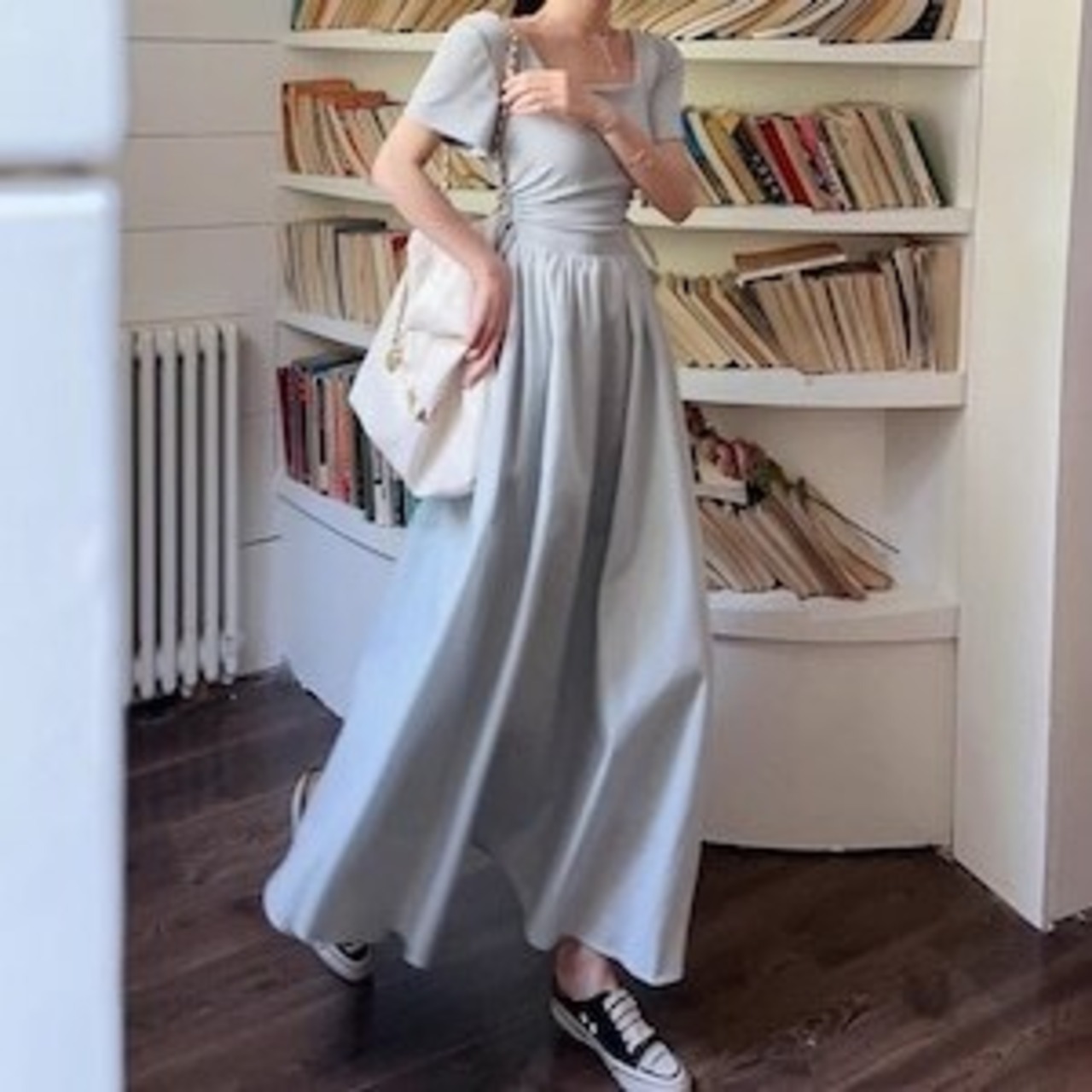 スクエアネックワンピース 半袖ワンピ ウエストギャザー エレガント E822